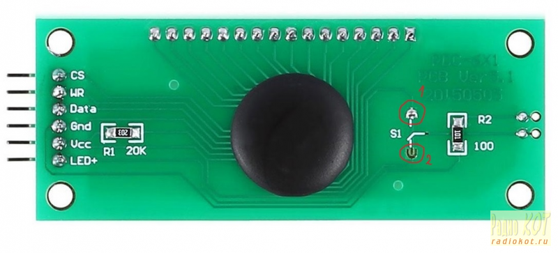 Если каплей припоя замкнуть контакты в точке 1, то положительный выход подсветки будет подключен к Vcc, и подсветка будет включаться при подаче напряжения на плату. Если замкнуть контакты в точке 2, то положительный выход подсветки будет подключен к LED+, и для включения подсветки на этот контакт надо дополнительно подать напряжение.