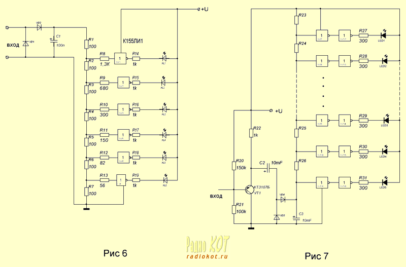 На рисунках 6 и 7 представлены измерители на инверторах ТТЛ и КМОП - логики. Основные характеристики приведённых схем практически одинаковы. Ядром схем является резистивные АЦП, построенные на резисторах R1-R7 (рисунок 6) и R23-R26 (рисунок 7). Представляя собой делители напряжения, они определяют пороги срабатывания каждой из ячеек. Основной недостаток приведённых схем - небольшой диапазон измерения, высокий уровень подводимого сигнала и изменение яркости свечения при увеличении количества включенных светодиодов. Справедливости ради необходимо отметить, что последний недостаток присущ многим схемам с подобным включением линеек светодиодов. Устраняется он применением стабилизатора в цепи питания линеек.