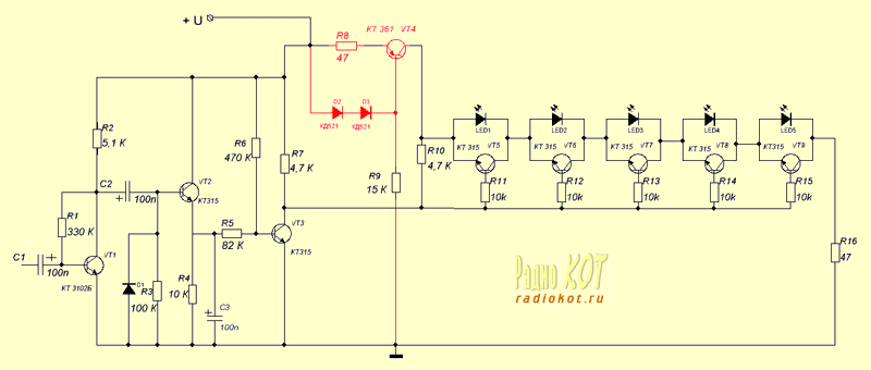 Гораздо лучшими показателями обладает измеритель, показанный на рисунке 8. Он состоит из входного усилителя (VT1), детектора (VT2), и усилителя постоянного тока (VT3). С выхода УПТ сигнал поступает на ключи VT5-VT9; именно они управляют светодиодной линейкой LED1-LED5.