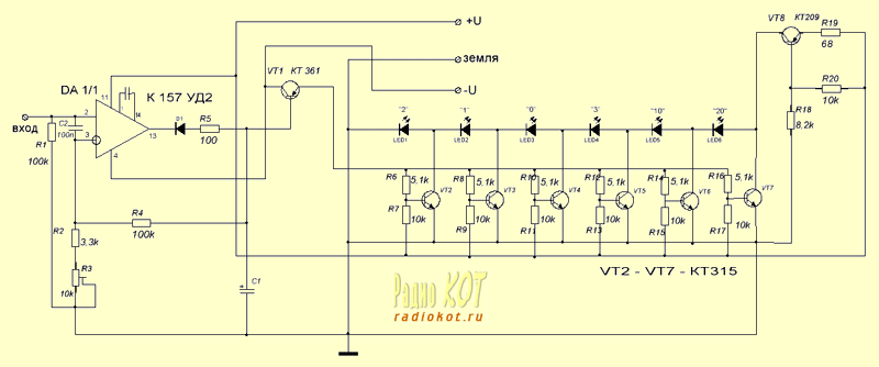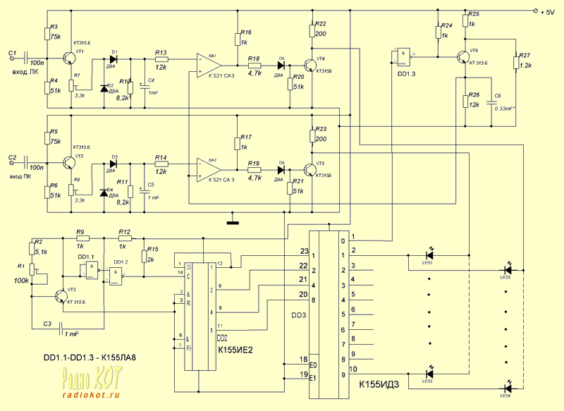 Теперь рассмотрим входной узел, состоящий из: буферного усилителя (VT1, VT2), детектора (VD1 - VD4), компаратора (DA1, DA2) и транзисторных ключей управления линейками светодиодной матрицы (VT4, VT5). Как видим, никаких особенностей схема не имеет. Усиленный буферным усилителем сигнал выпрямляется и сглаживается в детекторе, и , далее, поступает на один из входов компаратора. На другой вход поступает образцовый сигнал. При совпадении этих сигналов, компаратор открывает транзисторные ключи и подключает светодиодную линейку к массе. Говоря иначе - гасит светодиоды.