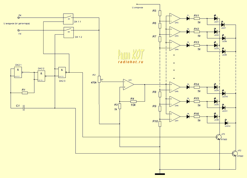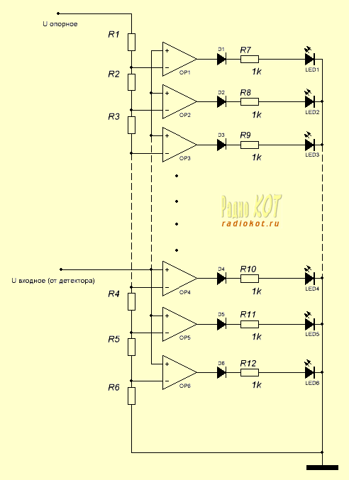 Основу индикатора составляют компараторы на ОУ. Работу такой ячейки мы рассматривали ранее. Все неинвертирующие входы ОУ объеденены и на них подаётся измеряемое напряжение от детектора. Инвертирующие входы подключены к резистивной матрице. Номиналы матрицы рассчитаны так, что с выводов средних точек резисторов снимается напряжение, с которым и будет сравнивать входное напряжение ячейка индикатора. То есть мы имеем возможность выставить значение каждой точки и, следовательно, выбрать их количество, диапазон измерения, и зависимости (линейную, S-образную, логарифмическую). Необходимо отметить, что на точность показаний оказывает влияние стабильность работы источника опорного напряжения.