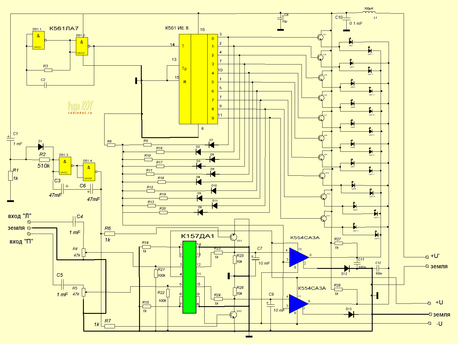 Отмечу, что если заменить счётчик К561ИЕ8 на комплекс: счётчик (К561ИЕ11) - дешифратор (К561ИД1 две штуки), то можно получить индикатор с 16 сегментами свечения (16 светодиодов на канал). Был разработан индикатор на 19 уровней (2 штуки К561ИЕ8). Однако его реализация оказалась сложнее, рассмотренных выше схем, по этому не рассматривается в этой статье.
