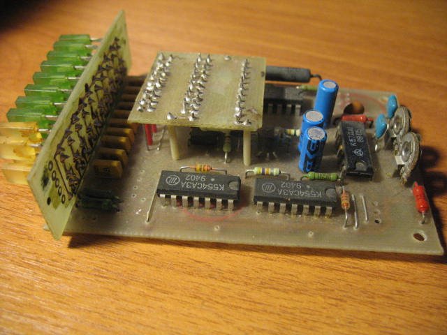 На элементах DD1.3 и DD1.4 собран ждущий мультивибратор. Он вырабатывает положительный импульс некоторой длительности при подачи напряжения питания на индикатор. Этот импульс открывает транзисторы VT1 и VT2 и отключает индикатор на время переходных процессов. Катушка L1совместно с конденсаторами С8, С10 представляет собой простейший индуктивный фильтр, устраняющий проникание помех от генератора по цепям питания в другие устройства. Собранный из исправных элементов, индикатор практически не нуждается в налаживании, просто необходимо убедиться в работоспособности генератора и выставить частоту следования импульсов 250-350 Гц. Вот такой вид имеет индикатор у меня: