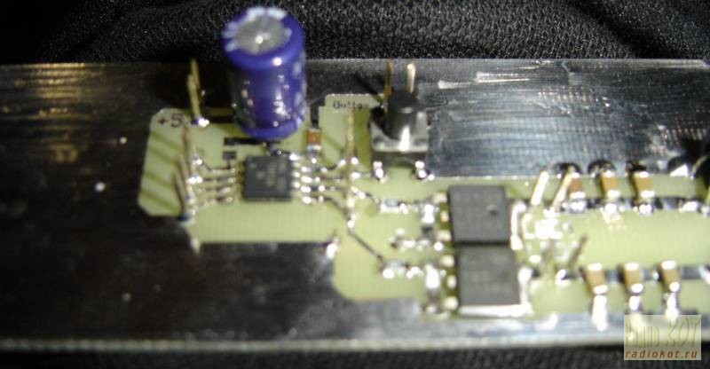 Полевые транзисторы взяты с материнской платы, N канальные. Контроллер использовался в корпусе SO8W (он пошире чем обычный SO). Резисторы в затворах для защиты контроллера и компенсация возбуждения на высоких частотах (на печатной плате проводники от управляющей ножки МК до затвора транзистора должны быть минимальной длины). Резисторы с затвора на землю для исключения самооткрывания транзисторов. Конденсаторы на 100n обычные блокировочные, электролиты на 100мкф. Можно ещё добавить подтяжку вывода Reset к плюсу питания. Так же, если подключать светодиоды непосредственно к выводу МК, то сигнал ШИМ нужно сглаживать RC цепью. Штырьки на печатной плате сделаны для удобства внутрисхемного программирования. Несколько фото на последок: