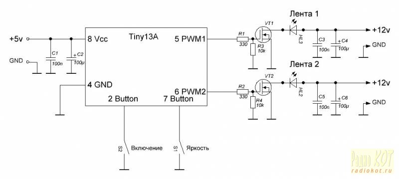 Вот и вся программа, она собственно довольно примитивная, рассчитана на новичков в программировании. За код не ругайте, программистом не был никогда и сейчас им не являюсь. Часть 3. Схема и готовое устройство. Как было сказано выше, устройство делалось для управления подсветкой ЖК монитора. В имеющемся мониторе умер инвертор, 2 лампы и что самое нехорошее, отсутствовали ВСЕ сигналы управления инвертором, ни яркости ни выключения отключения не было. Так что решено было сделать своё. В начальной версии кнопки отключения не было, так монитор и отправился к владельцу (это было безвозмездное ремонтирование, в целях обучения). Вместо ламп были применены светодиодные ленты, 2 штуки, потребление одной ленты составило 500ма (точнее отрезков ленты определённой длины). Из этого следует, что в МК будут подключены управляющие транзисторы. Питание их осуществляется от штатного источника напряжения монитора (в моей ленте применяется параллельное соединение групп последовательно соединённых по три штуки светодиодов, это для ленты на 12 вольт, группы по 3 светодиода имеют свой ограничитель тока - резистор, потом источник тока ленте не нужен). Сама схема:
