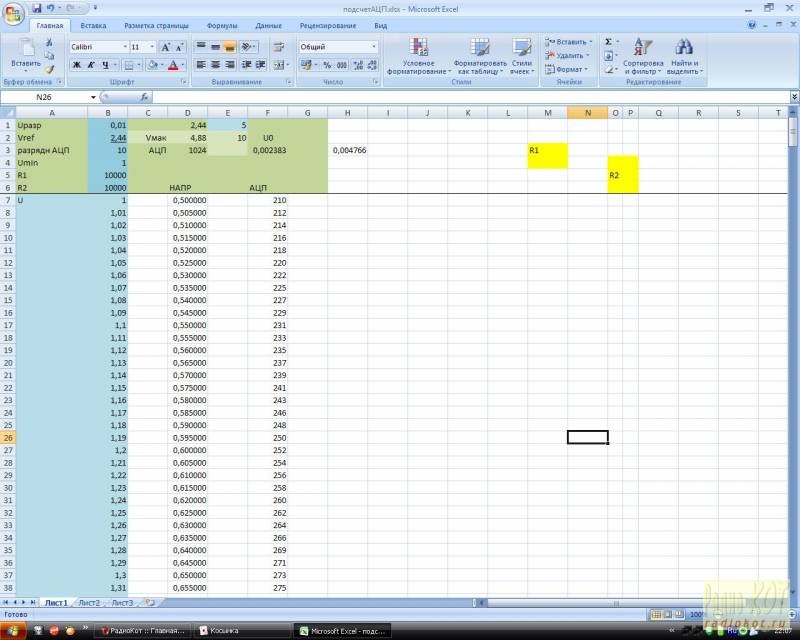 Подсчет значений АЦП после делителя на резисторах. Это даже не схема и не программа, к тому же моя работа участвует в конкурсе. На усмотрение модераторов, думаю пригодиться котам и моим любимым Кошечкам, тем более тем, кто дружат с паяльником. И ЕЩЁ РАЗ ПОЗДРАВИТЬ мой ЛЮБИМЫЙ сайт с ДНЕМ РОЖДЕНЬЯ и всех КОТОВ И КОШЕЧЕК. ВСЕХ БЛАГ!!!!!!!!!!!!!!!!!! Надоело мне как-то нажимать кнопки у калькулятора, да потом еще вспоминать значения делителя и хуже того, чтоб повторить друзьям и родственникам разбирать то, что работает. Сначала хотел сделать красиво, в виде отдельной программулены, но потом подумал, делов то на 5 мин в EXCEL, да и поменять или добавить что либо, плевое дело. Сейчас постоянно пользуюсь и сразу сохраняю вместе с проектом. Зато потом и опорное напряжение, и значение делителя, и значение коэффициентов АЦП, все есть и при ремонте или повторение помогают. Смотрим картинку или открываем файл. Важно! защиту формул не делал, поэтому аккуратней. A1-A6-E1-E6: ВВОД данных B7 и тд напряжение на входе делителя D7 и тд напряжение после делителя и на АЦП Если делителя нет -R2=1 (B6) R1=0(B5) тогда B7 и т д =D7 и т д равны. F7 и тд коэффициент АЦП U разр(B1)- с каким разрешением считается напряжение. Нужно 0,01В -задаем B1, значит B7 и тд будет через 0,01В Vref(B2)- значение ИОН разрядн АЦП (B3) –разрядность АЦП Umin(B4) для удобство просмотра, нужно смотреть с 1В B7 и тд начинается с 1В, нужно другое -задаем нужное R1 (B2) и R2 (B3) сопротивление делителя в ОМ нужно 10К заносим 10000 D1 повторяет Vref и пересчитывает в D2 максимальное напряжение после делителя, которое АЦП может схавать. E1 тоже самое но можно задать, чтоб прикинуть в E2 D3 и так понятно завит от разрядн АЦП (B3) F3 напряжение МР при данной разрядности H3 что то считал – не смотрим Еще, если F7 и тд D7 и тд закрашиваются в красный, значит, выходим за предел. УДАЧИ! Думаю вопросов на форуме не должно возникнуть, но может кто нибудь, что-то добавит.