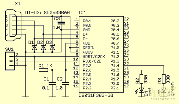 Автор: Сергей Безруков aka Ser60 Фирмой Silicon Laboratories выпускается несколько серий микроконтроллеров (МК) семейства C8051 со встроенным USB модулем, обеспечивающим полноскоростной трафик со скоростью, до 12 Мбит/сек. Здесь пойдет речь о самой новой серии F38x, появившейся на рынке в 2011 году. МК этой серии совместимы по выводам с МК серии F340, выпускаемым уже на протяжении 2-3 лет, и являются их дальнейшем усовершенствованием. Отличительной особенностью семейства F38x является наличие встроенного прецезионного генератора, позволяющего МК работать с шиной USB без применения внешних кварцевых резонаторов. Сам МК также может тактироваться от этого генератора, обеспечивая максимальную производительность в 48 MIPS (большинство инструкций МК выполняются за 1-2 цикла тактовой частоты). Возможно тактирование МК и на более низких частотах. Микроконтроллеры оснащены внутренней памятью (RAM) объемом 2Кб или 4Кб в зависимости от модели, из которой до 1Кб может быть использовано под буферы USB. Объем флэш-памяти программ составляет от 32Кб до 64Кб и имеется полный джентельментский набор периферии в виде 2 компараторов, 10-битного АЦП с производительностью 500 киловыборок в секунду и опорником, 6 16-битных таймеров и 5 таймеров/счетчиков с режимом захвата и генерации ШИМ, а также интерфейсы последовательно обмена данных I2C, SPI, UART, которые могут быть использованы одновременно. Важно отметить, что все МК семейства C8051 обладают внутренним коммутатором ресурсов, позволяющим программно перенаправить аналоговые и цифровые входы/выходы периферии на практически любые выводы корпуса. Это очень удобно при разводке печатной платы. Помимо безвыводных корпусов типа QFN, МК серии F38x выпускаются и в корпусах LQFP-32 или TQFP-48, причем первые имеют шаг выводов 0,8 мм и довольно легко паяются в домашних условиях. Как и любая другая фирма, выпускающая МК с аппаратным USB драйвером, Silicon Labs также предлагает базисное программное обеспечение для их программирования на языке C с примерами. При этом можно довольно просто реализовать USB устройства, например, класса HID (Human Interface Device), используя библиотеку SLABHIDDevice.dll, описанную в «аппноуте» AN249. Помимо этого, для еще большего упрощения интеграции своих микроконтроллеров с шиной USB фирма разработала высоко-уровневую систему USBXpress®, использующую эксклюзивный драйвер (но только для Windows), см. «аппноут» AN169. Оба документа можно загрузить с вебсайта фирмы ( www.silabs.com ). Мы рассмотрим оба способа связи. Тестовая схема Приведенные здесь примеры программ адаптированы под следующую тестовую схему.