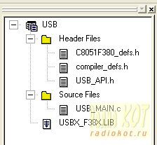 VID_10C4 – это идентификатор фирмы Silicon Laboratories, присвоенный ей организацией USB-IF (USB Implementers Forum). Фирма разрешает пользоваться своим идентификатором для USB устройств на основе ее продукции. PID_EA61- это в данном случае произвольно установленный идентификатор устройства в программном обеспечении. Для экспериментов вполне сойдет и такой, но для массовой продукции следует обзавестись идентификатором своиx изделий, например, запросив об этом фирму (бесплатный сервис!). Помимо драйвера установка системы USBXpress включает документацию («аппноут» AN169), библиотеки для интерфейса с программой МК компьютера (в папке USBXpress_API), позволяющие импортировать библиотеку в компьютерные программы на языках Basic, C++, и C#. Приводится также и пара примеров программирования устройств для разных типов МК с интерфейсом к ним на языках Visual C++ 6.0 и Visual Basic 6.0. Однако, для этих программ имеется лишь минимум документации и комментариев. Цель настоящей статьи восполнить этот пробел и предоставить еще один и более простой пример. Отметим, что библиотека USBXpress также предоставляет средства для интерфейса с преобразователями USB – UART серии CP210x, но эти функции в настоящей статье не рассматриваются. Программное обеспечения для МК Программы для МК написаны на языке C и находятся в папке USBXpressMK в прилагаемом архиве. По открытии файла проекта USB.wsp системой Silicon Labs IDE (бесплатная загрузка с вебсайта фирмы) Вы увидите следующие его составляющие: