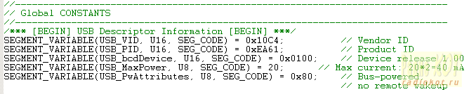 Все заголовочные файлы с расширением .h, а также библиотека USBX_F38X.LIB, предоставляются фирмой и изменений не требуют. Следует лишь включить их в проект. Все функционирование устройства описано в файле USB_MAIN.c. Этот файл начинается с установки параметров USB устройства. Параметры VID и PID прокомментированы выше, за ними идет номер версии устройства (может быть выставлен произвольно) и информация для драйвера USB компьютера о токопотреблении устройства (требуется стандартом USB) в градациях 2 мА. Для нашего устройства 40 мА будет достаточно.