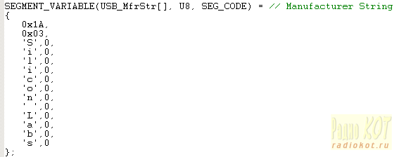 Эти установки завершаются дополнительной информацией об имени производителя, названии устройства, и его серийного номера. В нашем случае эти параметры имеют лишь информационный характер. Вот, к примеру, как выглядит информационная структура о производителе. Первые 2 ее байта (0x1A, 0x03) говорят драйверу USB к чему эта структура относится, а остальные символы строки производителя должны быть представлены в кодировке Unicode. Именно поэтому каждый символ требует двух байтов и после каждой буквы из Латинского алфавита присутствует 0 (в соответствии с порядком байтов little endian):