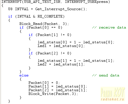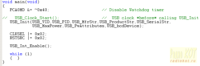 Главная функция заканчивается установкой тактирующей частоты МК (CLKSEL), разрешением сброса МК по питанию (RSTSRC), и разрешением прерываний от USB модуля. После этого программа входит в бесконечный цикл и управляется прерываниями. Обработчик прерываний также состоит лишь из нескольких строчек. Он настроен на прием и обработку запросов из компьютера.