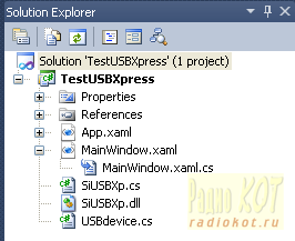 В нашем случае управления светодиодами МК получает 3 байта из компьютера. Если первый из них равен 0, то происходит прием и обработка данных (включение и отключение светодиодов), а если 1 – то это запрос на передачу состояния светодиодов в компьютер. Первый байт пакета (Packet[0]), таким образом, регламентируется системой USBXpress. Второй и третий байты пакета в нашем случае информационные. Второй из них (Packet[1]) управляет состоянием красного светодиода (0 – не менять состояние, 1 – изменить на противоположное), а третий (Packet[2]) аналогичным образом управляет зеленым светодиодом. При передаче в компьютер нулевое значение этих байтов соответствует выключенному состоянию соответствующего светодиода, а значение 1 – включенному. Такой формат данных используется программой компьютера. При необходимости можно передавать и большее число байтов в пределах одного пакета, но не более 63. Это ограничение накладывается стандартом USB на размер пакета в транзакциях типа Bulk Transfer, используемых системой USBXpress. При передаче еще большего числа данных их следует программно разбивать на пакеты меньшей длины перед передачей. В примерах использования библиотеки USBXpress имеется пример передачи длинных файлов между компьютером и МК. Все неопределенные здесь функции типа Block_Read(), Block_Write() и т.п. подробно описаны в «аппноуте» AN169. Загрузочный модуль программы занимает около 3,8Кб в памяти МК из 32Кб имеющихся. Программное обеспечение для компьютера Демонстрационная программа для компьютера имеет графический интерфейс, написана на языке C# с использованием WPF (Windows Presentation Foundation) и отлажена в среде Microsoft Visual Studio 2010 с установленной системой .NET версии 4.0. Работа программы проверена в операционных системах Windows XP (32-битная версия) и Windows 7 (64-битная версия). При описании программы предполагается, что читатель обладает хотя-бы начальными знаниями в области объектно-ориентированного программирования. В прилагаемом архиве программы находятся в папке проекта USBXpressComputerTestUSBXpress. Файлы App.xaml и App.xaml.cs – стандартные стартовые и генерируются Visual Studio автоматически. Файл MainWindow.xaml также генерируется системой и содержит описание графического интерфейса программы. Вопросы создания графического интерфейса в Visual Studio с использованием WPF выходят за рамки настоящей статьи и здесь не рассматриваются. Для открытия проекта в Visual Studio кликните мышкой на файл TestUSBXpress.sln. В окне менеджера проекта Вы увидите следующее: