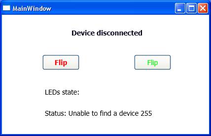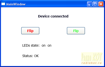 Кнопки служат для изменения состояния соответствующего по цвету светодиода. Если сейчас вставить в компьютер USB кабель от устройства или запустить программу с подключенным заранее устройством, окно программы будет выглядеть так (при запуске программы МК оба светодиода загораются):