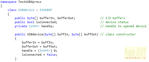 Ниже приводится краткое описание программ проекта. C# класс SIUSBXP описанный в файле SiUSBXp.cs из пакета USBXpress состоит из определения констант и импортирует функции библиотеки в C#. Его менять не стоит. На основе этого класса создан подкласс USBDevice, наследуюший весь функционал от класса SIUSBXP и содержащийдополнительные методы, необходимые для реализации нашего устройства. Он имеет 4 собственных поля – ссылки на буферы ввода bufferIn и вывода bufferOut для коммуникации с устройством, устанавливаемых конструктором класса, ссылку handle на само устройство, и булево поле isConnected, хранящую статус подключения устройства к компьютеру.