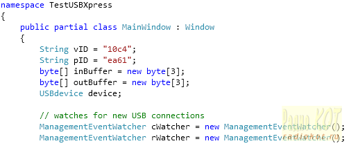 Помимо конструктора класс имеет 7 простых собственных методов, созданных на основе API функций библиотеки, имена которых говорят сами за себя. Это методы для подсоединения и отключения устройства (open() и close()), получения числа подключенных к компьютеру USBXpress устройств getDevices(), и получения VID и PID (getVID() и getPID()) первого устройства в списке. Предполагается, что одновременно к компьютеру будет подключено не более одного USBXpress устройства. Наконец, там-же имеются методы посылки массива байтов в устройство - sendToDevice() и запроса и приема массива из устройства – getFromDevice(). Все методы генерируют исключения (exceptions) если что-то «выйдет криво», сообщения которых показываются в окне программы в графе Status. Файл главного класса программы начинается с установки переменных vID и pID в соответствии с их значениями в программе МК. Настоящая программа устанавливает связь только с первым в списке устройством с такими параметрами. Список формируется автоматически операционной системой. Помимо этого, в начале класса создаются буферы ввода/вывода и мониторы событий cWatcher и rWatcher для автоматического распознавания подключения и, соответственно, отключения устройства.