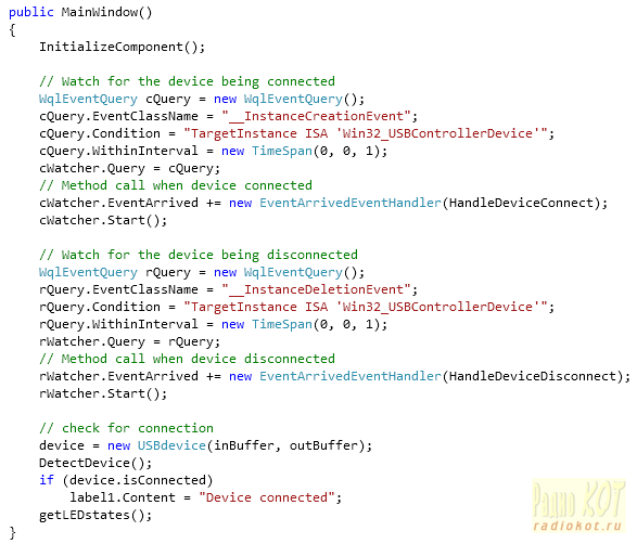 В конструкторе класса вызывается метод создания графического интерфейса InitializeComponent() и созданные выше мониторы настраиваются на проверку подключения или отключения устройства каждую секунду. Кроме, того для мониторов декларируются функции обработчиков их прерываний HandleDeviceConnect() и HandleDeviceDisconnect(), соответственно.