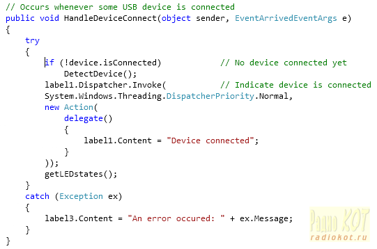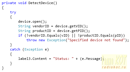 В конце конструктора производится проверка подключения устройства к компьютеру функцией DetectDevice. Она открывает первое устройство, обслуживаемое драйвером USBXpress и проверяет наше-ли оно по vID и pID. Если устройство наше, то производится соединение с ним. В противном случае генереруется исключение.
