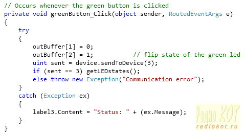 Наконец, обработчики прерываний нажатий кнопок формируют пакеты для отправки в устройство. Оба обработчика аналогичны по структуре, ниже приведен один из них. Параметер 3 метода sendToDevice() устанавливает длину передаваемого массива и возвращает число посланных успешно байтов.