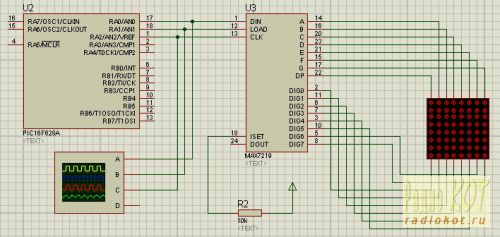 Инициализация: //выключить тест дисплея. Для проверки модуля и программы была собрана следующая схема в Proteus, а затем и на макетке. В железном исполнении схема собрана из pic16f628a и модуля матрицы. Pic тактуется внутренним генератором. Приведенный исходник программы позволяет прогнать небольшой тестик и убедиться в работоспособности модуля. Исходник на С , прошивка HEX v1, прошивка HEX v2 (с изменением яркости).
