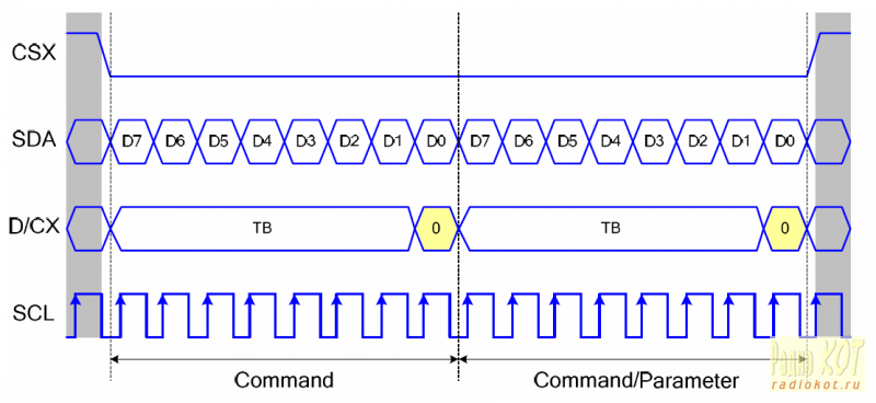 Итак, приступим. Управление дисплеем ведётся посредством SPI в режиме «0», т.е. считывание информации, передаваемой в дисплей, происходит при переходе уровня тактового сигнала от низкого к высокому: