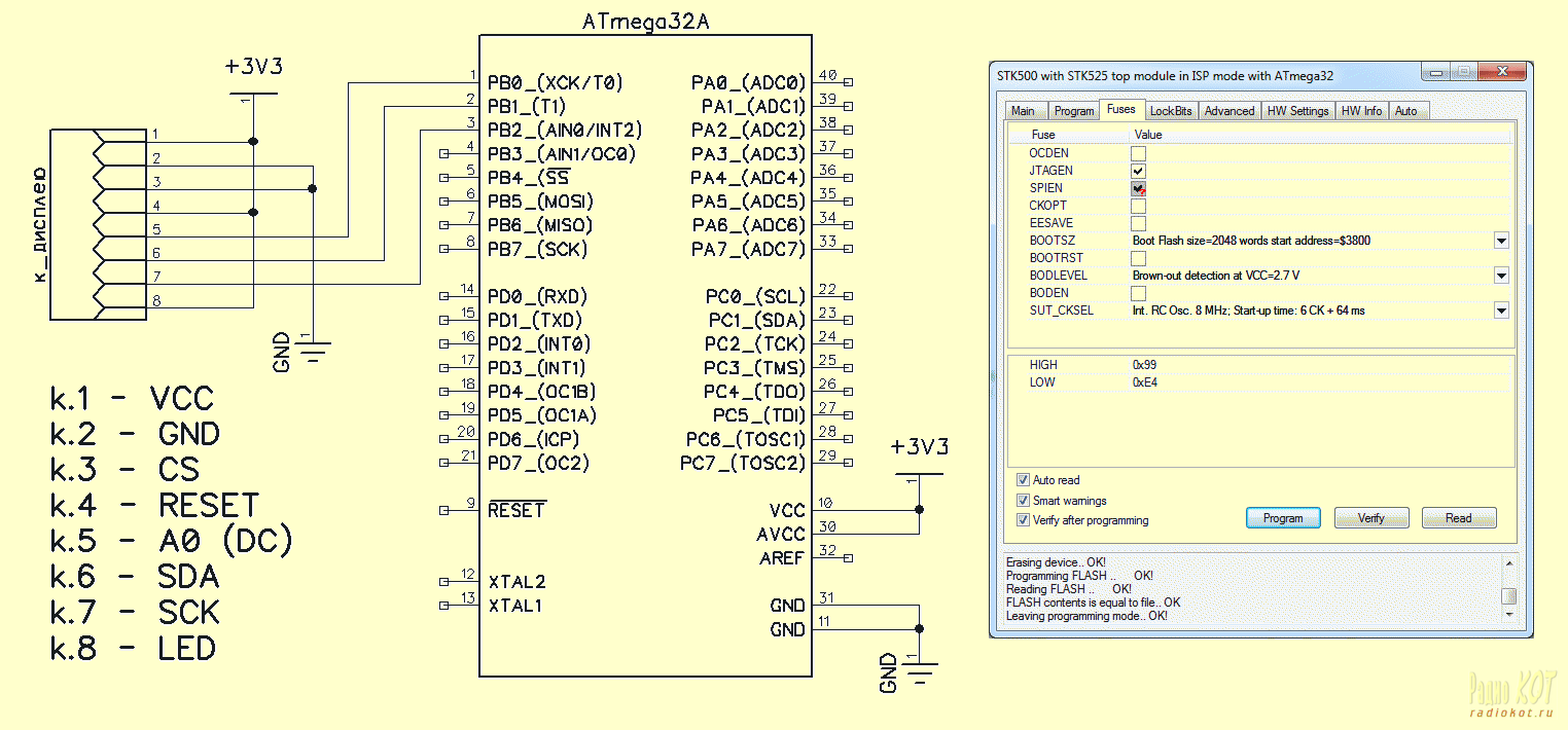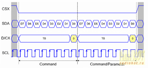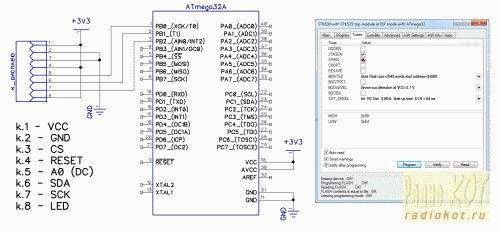 При этом информация, передающаяся в дисплей, может интерпретироваться им, как команда, либо как параметр команды, либо как данные для вывода на экран. Замечу, что в качестве команды здесь принимается байт, младший бит которого передан при низком уровне на ножке А0 (линия D/CX), а в качестве параметра или данных – байт, младший бит которого передан при высоком уровне на этой ножке. В моём случае этот алгоритм реализован программно, при этом сама Мега работает от внутреннего тактового генератора на 8 МГц. Схема подключения примитивная: