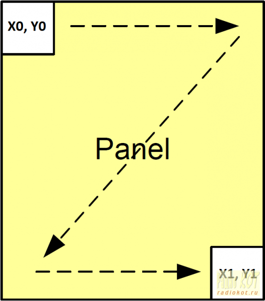 В этом случае при выводе на экран мы получим замену красного цвета на синий и наоборот. Для борьбы с такой инверсией нам будет достаточно либо изменить очерёдность передачи байтов и битов, т.е. сначала передавать второй байт кода цвета, а затем первый в последовательности от LSB к MSB, либо воспользоваться командой MADCTL. Применив эту команду с параметром 0x08 мы, передавая данные первоначальным способом, изменим очерёдность их вывода на программном уровне и получим правильную цветопередачу без особых хлопот с кодом. Т.к. при работе с кодом, который компилит ConvertBMP (можно скачать в приложении) мой экран ведёт себя неподобающим образом, я выполняю эту команду с описанным параметром сразу при инициализации дисплея. В вашем случае, в зависимости от используемого конвертора и попавшего к вам дисплея, существует вероятность, что эта процедура окажется излишней. Из оставшихся трёх (использованных мной, на самом деле их существенно больше) команд CASET (0x2A) и RASET (0x2B) задают верхнюю левую (X0, Y0) и нижнюю правую (X1, Y1) координаты области по оси Х (CASET) и по оси Y (RASET), в которую мы желаем попиксельно выводить информацию.
