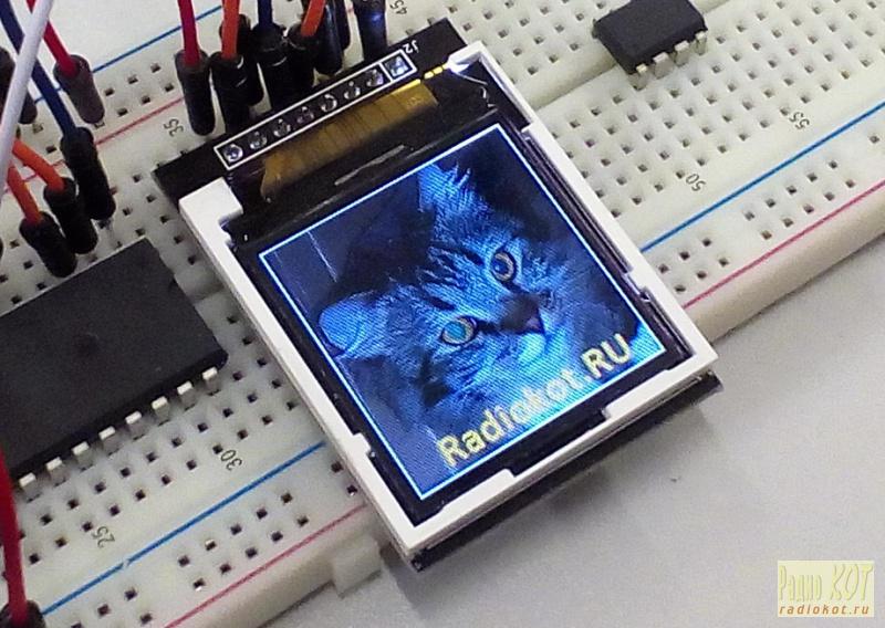Как видно по надписям на фото, его экран имеет разрешение 128*128 точек, а на сайте продавца указано, что он построен на базе контроллера ST7735 от SITRONIX. Оговорюсь, что, как и в предыдущем случае, целью данной статьи является, прежде всего, описание основных приёмов работы с этим дисплеем посредством AVR микроконтроллера: инициализация и вывод информации, посему не выкладываю никаких библиотек не из вредности характера, а потому, что просто не создавал их за полной для себя ненадобностью, за что заранее прошу у всех прощения. Тем не менее, в приложении к статье вы можете скачать пример с подробно прокомментированным исходником по выводу вот такой цветной картинки, взятой из РадиоКототеки (надеюсь, автор фото не обидится):
