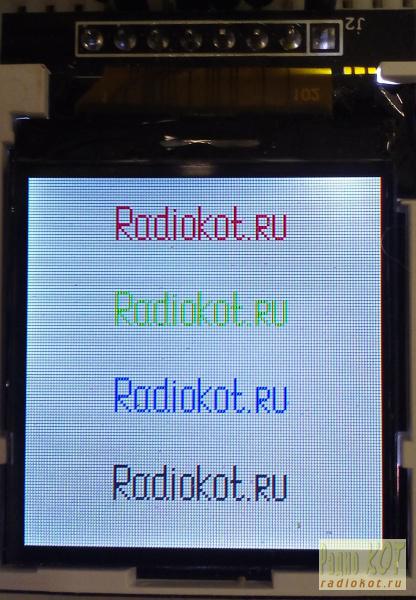 Фотография, сделанная телефоном, не способна передать реальное качество изображения, но, поверьте, вживую оно выглядит более, чем достойно )) В отличие от вывода полноцветного изображения, кодировка которого требует уйму места в памяти, для вывода одноцветных изображений любого цвета объём кода не намного превысит требующегося для работы с монохромным дисплеем, т.к. в этом случае есть возможность управлять каждым пикселем побитно, т.е. одним байтом сразу 8-ю точками экрана. Для реализации такого незадокументированного способа мы воспользуемся редактором, который позволяет кодировать байт информации не сверху вниз, а горизонтально. Отличный вариант такого редактора – TheDotFactory (можно скачать в приложении). После поместим полученный код в память, а при выводе информации на экран будем применять следующую уловку: закрашивать пиксель, который должен быть видимым (бит=1), цветом, отличным от цвета фона, а пиксель, который видимым быть не должен (бит=0), цветом, совпадающим с цветом фона. В итоге на экране можно получать всевозможные разноцветные надписи или картинки: