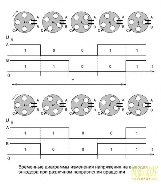 Для процессора ножки энкодера подтягиваем сопротивлениями к плюсу. Получается, что при разомкнутых контактах, через подтягивающие резисторы, на процессор поступает сигнал логической единицы. Это и будет наше стартовое условие. В программе мы будем проверять состояние только одного контакта. Не важно какого. Как только сработал один контакт( замкнул на массу) мы делаем маленькую задержку. Называется она задержка антидребезга. Потом снова смотрим сигнал на этой ножке. Четкая фиксация состояния. И если событие произошло , то смотрим сигнал на второй ножке. Я уже выше писал, что при вращении ножки поочередно замыкаются на массу. Вот в этот момент сигнал на второй ножке нам дает информацию об направлении вращения. При фиксировании сигнала, например, увеличиваем какое то значение регистра. Если сигнала нет, то уменьшаем. Как это выглядит на примере:
