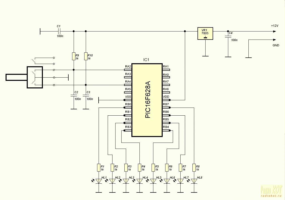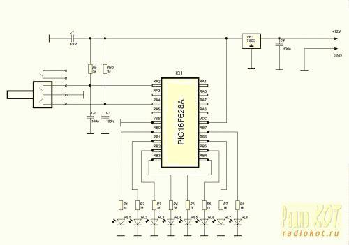 Эта плата скорее игрушка, но она позволяет наглядно посмотреть работу энкодера. Я взял довольно распространенный процессор PIC16F628A .Тактовый внутренний генератор на 4 мГц .На весь порт «В» я подключил восемь светодиодов. При инициализации процессора я зажигаю самый старший светодиод. Это ножка RB7. По изложенной методике я обрабатываю ножки процессора к которым подключен энкодер. При вращении по часовой я сдвигаю зажигание светодиода от RB7 к RB0. И обратно. Такой «бегущий огонек». )) В программе я поставил условия, чтобы при дальнейшем прокручивании энкодера в ту или иную сторону светодиод оставался гореть в одном из крайних положений.