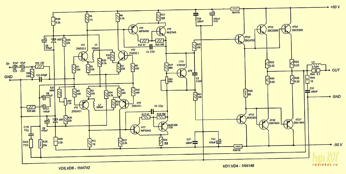 Симметричный усилитель, в котором предвыходной каскад работает в классе "псевдо А", тоесть к выходникам входного каскада следует прикрутить относительно не малые радиаторы. Тем не менее, меня привлек этот усилитель, и я решил его собрать. Также в этой ветке форума я наткнулся на такие цифры.
