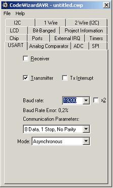 При создании проекта, компилятор сам спрашивает, будем ли мы использовать генератор кода, отвечаем утвердительно, наблюдаем: Выбираем необходимый нам чип и частоту кварца. BootLOader использовать не будем, потому ничего на этой закладке больше не трогаем. Идем на закладку USART: Ставим галочку Transmitter(передатчик), выбираем скорость, которая нас удовлетворяет и ошибки будут минимальны (лучше, конечно чтобы их вообще не было, но так не получится, BaudRateError будет показывать 0,1% минимум, т.к. кварц должен быть не на 4 МГц, а скажем 4,485902 МГц) и параметры связи (в сокращенной форме 8N1) режим асинхронный. Здесь также стоит уточнить, что Мега может работать в синхронном режиме. Нас пока больше ничего не интересует, а потому выбираем File->Generate, Save and exit. Он нам ещё позадает вопросы по поводу имен файлов для сохранения и пр., думаю тут разберетесь.
