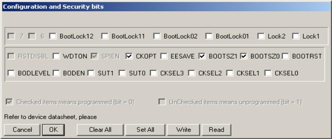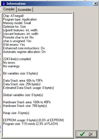 Вот сейчас поклонники ассемблера начнут меня гнобить, 2.9% памяти. Достаточно много (при 8 Кб, 2.9% = 232 байта), однако, нас это волновало мало. Кто опишет всё это на ассемблере, буду только рад. )) Если вы видите это окошко, значит всё скомпилировалось и ошибок нет. Открываем PonyProg или AVReal. Открываем окно программирования битов конфигурации (fuses). Это сааааамый щекотливый момент - по идее, нужно лезть в даташит и смотреть, как заставить мегу работать с внешним кварцем (про то, что если фузы настроить неправильно, то м/с в режим последовательного программирования не перейдет, я вообще молчу, будьте внимательны). Я вас так мучить не буду, скажу лишь, что Мега8 на заводе, программируется на работу с внутренним генератором 1МГц. С такой тактовой частотой вы не сможете получить более-менее приличную скорость связи. Мы настроили USART на 19200 при 4 МГц кварце. Значит нужно сделать вот так: