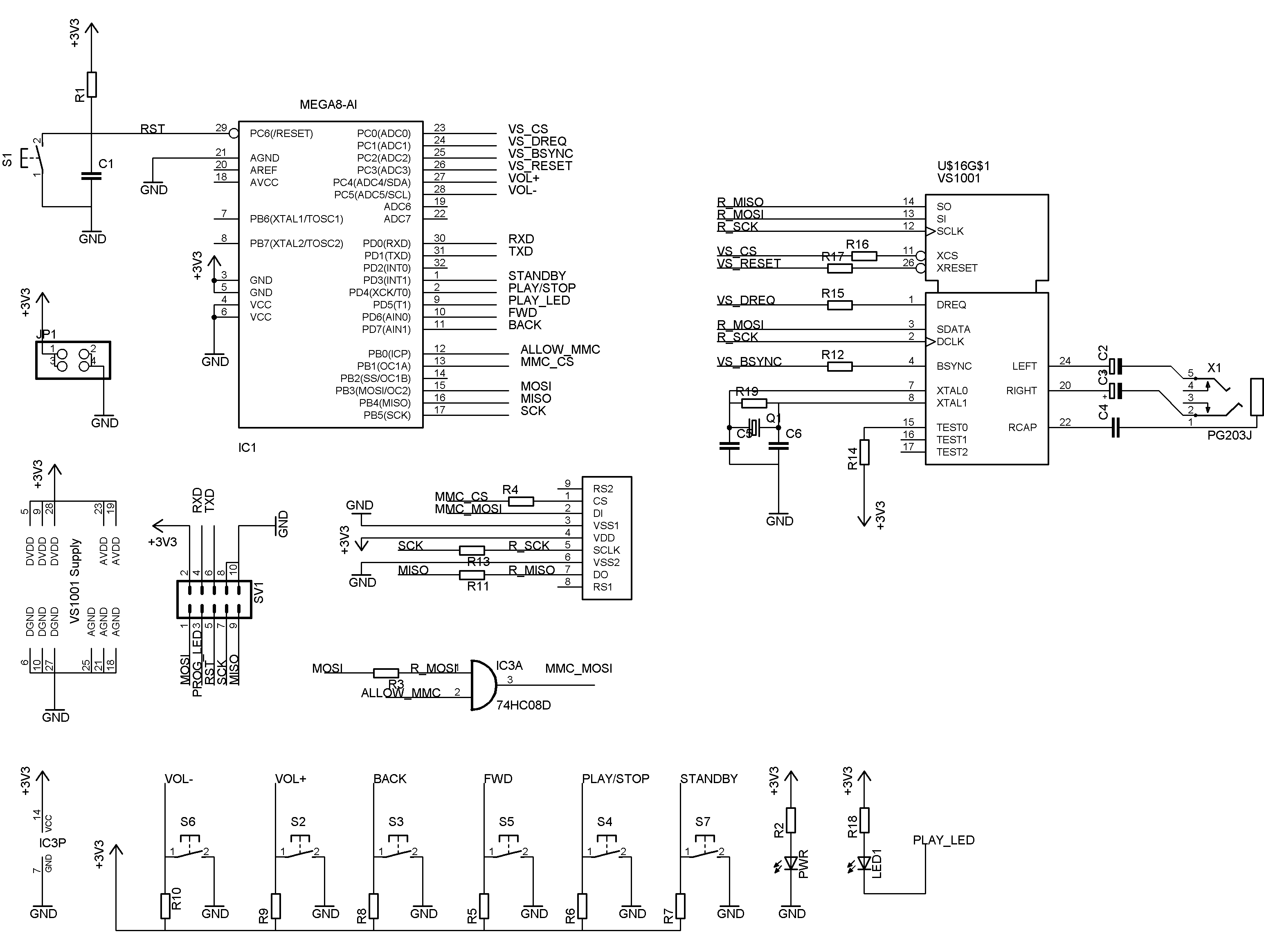 3-им оказался немецкий клон разработки корейских товарищей радиолюбителей. Он и стал основой доработки магнитолы. Схема была дополнена дросселями в цепях питания VS1001K как рекомендует производитель микросхем декодеров, установлен стабилизатор напряжения 78L03 и связка из 78L09 / 78L05 в целях уменьшения нагрева. П/плата не разрабатывалась, всё собранно на монтажных проводах (на фото представлены промежуточные варианты отработки схемы). В итоге проделанной доработки магнитола окончательно потеряла возможность воспроизводить кассеты (да это сейчас и не нужно) так как из неё удалён ЛПМ. В место крышки кассетного отсека установлена заглушка с четырьмя круглыми и одним щелевым отверстиями (две лишних кнопки мне не были нужны). Ко всему выше изложенному прилагается архив с материалами для повторения эксперимента над магнитолой.