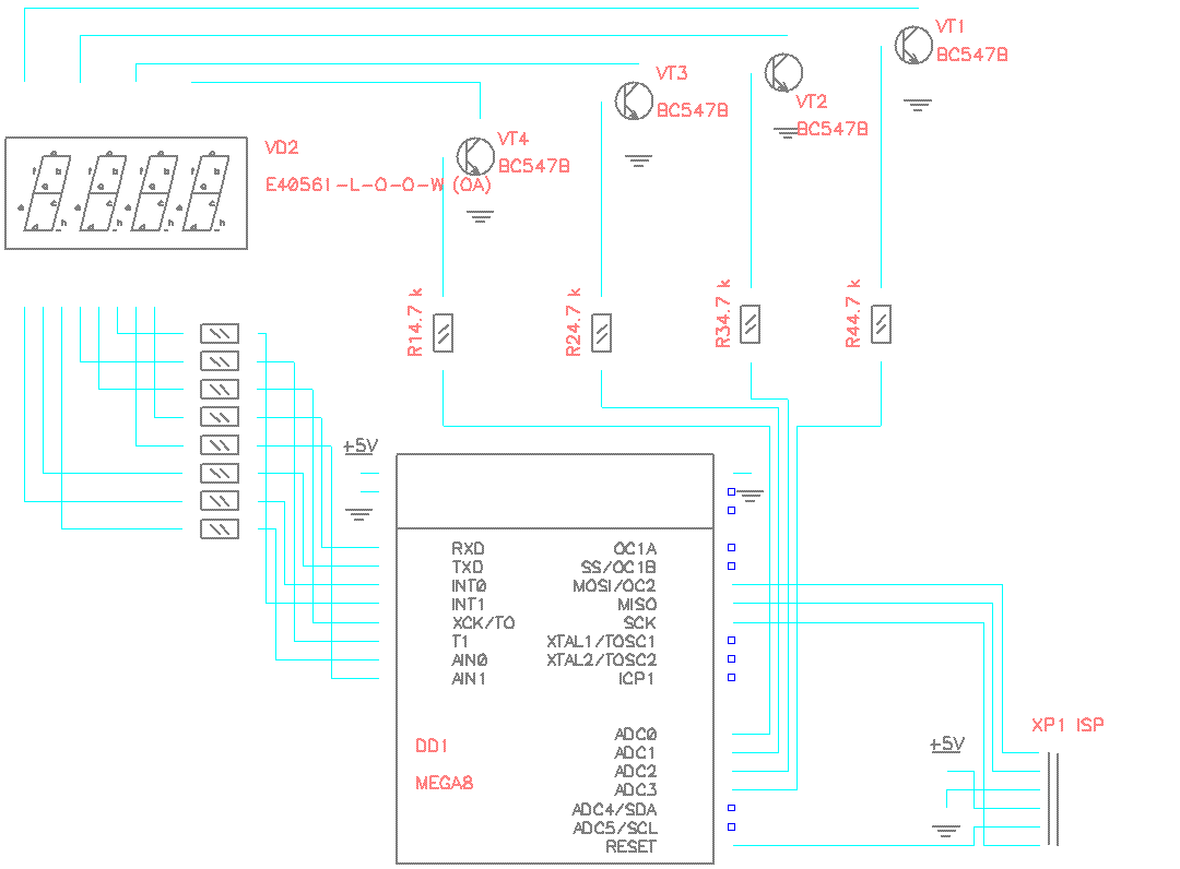 Далее, подключаем все по схеме. Тут стоит отметить что я малость неверно подключил выводы индикатора. Лучше сказать не как все. Если Вы будете подключать по-своему индикатор, нужно будет изменить значения в массиве digit_ar[]. Имейте ввиду.