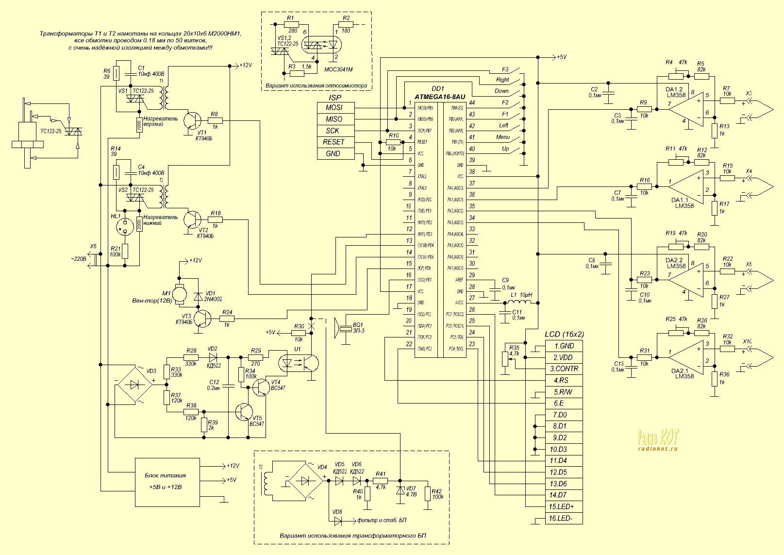 Схема состоит из блока усилителей термопар, МК с дисплеем, клавиатурой и звуковым сигнализатором, схемы детектора нуля, силовой части и блока питания. Блок усилителей собран на ОУ DA1 и DA2, вместо LM358 допускается использовать LM2904. Далее сигналы поступают на АЦП МК.