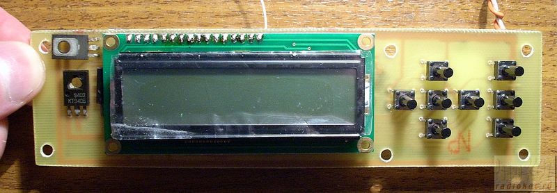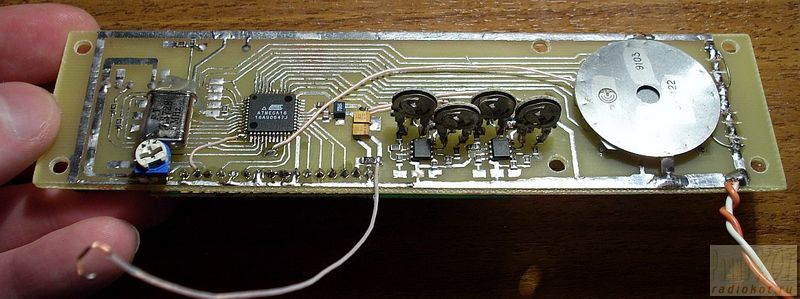 МК имеет типовую обвязку в виде клавиатуры и дисплея. LC-цепочка L1 C11 питает внутреннюю схему АЦП МК. Резистором R35 устанавливается контрастность дисплея. На плате выведены сигналы для внутрисхемного программирования (ISP). К МК так же подключен пьезокристаллический звуковой излучатель BQ1. Небольшое примечание по поводу подключения дисплея, в зависимости от производителя в дисплеях могут быть поменяны местами контакты 1 и 2 (питание) и еще возможно понадобится установить гасящий резистор в цепи подсветки (вывод 15 дисплея).