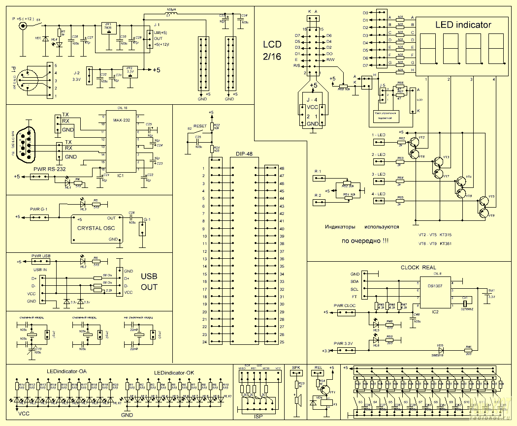 К особенностям платы можно отнести применения двунаправленных ключей управления LED индикаторов (можно управлять как ОА так и ОК).