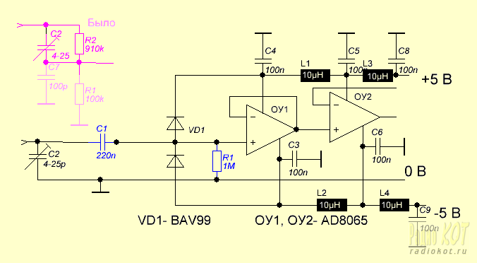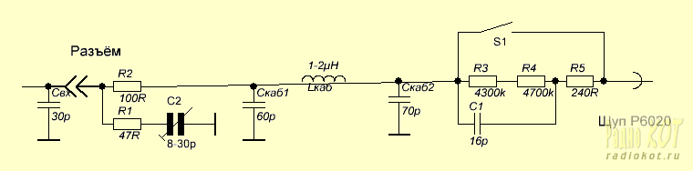 Вот это и предлагаю улучшить на канале СН-2, канал СН-1 предлагаю оставить без изменений- вдруг захочется посмотреть на секундах или минутах развёртку. Посмотрим на фото входной части одного канала. На входе стоит полноценный делитель на 10, затем сдвоеный диод BAV99 (код А7), два ОУ типа AD8065 (код HRA) до 145 МГц единичного усиления, мультиплексор 74HC4051D для переключения пределов напряжения. Схема переделки входной части одного канала довольно проста (нарисовал для простоты понимания с другими обозначениями деталей): убираем внутренний делитель R2, R1 (советую предварительно временно закоротить вход ОУ на корпус проводком чтобы не пробить наводками ОУ с входным сопротивлением 1000М), C7, затем меняем R1 на 1М и ставим в разрыв дорожки керамический конденсатор С1 ёмкостью не менее 0,1 мкФ (на частоте 2Гц будет провал до -6дб) напряжением не менее 100 В (определяет габариты и возможность измерений на постоянном напряжении переменки), С2 пересоединяем на корпус для подстройки прежнего импеданса по ёмкости для удобства работ при смене щупов. Теперь займемся переделкой одного щупа делителем на 100. Для этого срисовал с натуры штатную схему, обозначив кабель Скаб и Lкаб, хотя фактически они распределены по кабелю, но тем не менее резонансы на ВЧ присутствуют и делают АЧХ неравномерной, особенно если будет кабель с медной центральной жилой (именно у меня так), то провал от 7 МГц до 20 МГц очень большой до 3,7.. раза (разумееется надо щуп с кабелем менять). Сначала разберем щуп, обрезав кольцо по окружности перед началом сужения к кабелю и сточив 2 противоположные точки опресовки, далее последовательно все части щупа вынимаются. Переделка заключается в отпайке конденсатора 16 пф (на фото видно вместо него припаяна скрутка 2-х эмалированных проводов, но оказались лишними при настройке меандра, достаточно ёмкости монтажа) и припайке на контакт с кабелем на корпус резистора 100к (образует с входным сопротивлением 1М нужные 90к с допуском). Этот щуп можно подключать и на СН-1, где он расширит верхний предел измерений до 500 В/дел, но надо помнить что по характеристике производителя на 10х щуп допускал 600 В до 40 кГц, а далее уменьшалось до 20 В. Щуп 100х уже допустит 600 В до примерно 4 МГц, т.к. нагрев зависит от уменьшения ёмкостного тока в квадрате, а далее думаю до 200 В, но не проверял. Подведём итоги: 1) чувствительность на канале СН-2 повысили 2) вход СН-2 сделали закрытым 3) ёмкость щупа 100х стала примерно 2 пф, вместо 17-19 пф на 10х 4) верхний предел напряжения на СН-1 со щупом 100х до 600 В или 200 В на 40 МГц Вот и всё. Желаю творческих успехов! Борис.