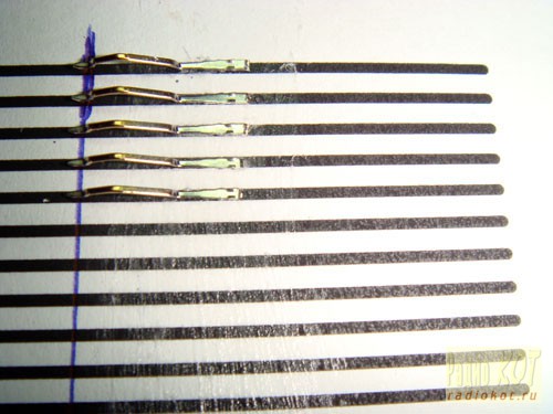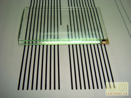 Вообще присоб.. присоединять контакты пытались довольно давно. Самый распространенный способ это использование токопроводящей резины, но она рассыхается и со временем, теряет свои свойства. Да и достать её проблематично. Так и остаётся дисплейчик в гордом одиночестве. Не раз, приходилось, пробовать разные методы, да всё останавливало множество контактов и тонкость проводников. Сколько всего перепробовано, наверное, тысячи замесов медной пудры с эпоксидной смолой и сотни километров оголённой проволоки - все, напрасно. Контакты упорно не желали давать, этот самый, контакт и прочность. Приходилось даже подумывать о необычном хитром приспособлении. Да стоит ли игра свеч? И вот... В один прекрасный день пришла она! Даа! Красота!!! Рыжая, с чёрно-белыми пятнами на бортах, глаза добрые... Немного посидела... и ушла... А, да, пришла мысль, которая позволила присоединить любое множество контактов. Итак, дорогой Кот, всё по порядку. Сначала возьмём, что-нибудь, по больше, для наглядности.