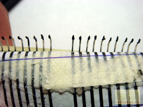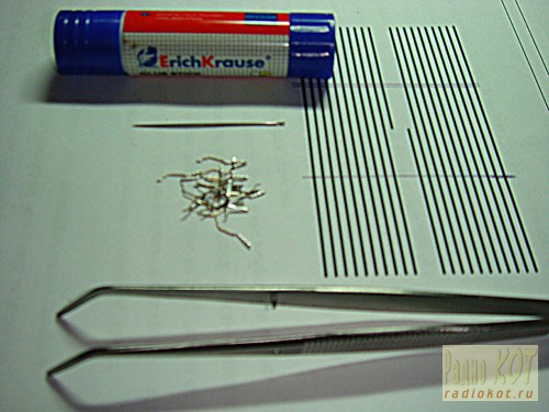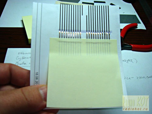 С помощью остатков, Эрика Краузе, наносим слой клея на дорожки и неспешна, с помощью пинцета, иголки и кошаче-собачьего терпения, ровненько, прикрепляем контакты к проклеенной бумажке.